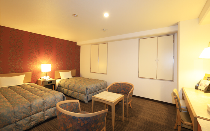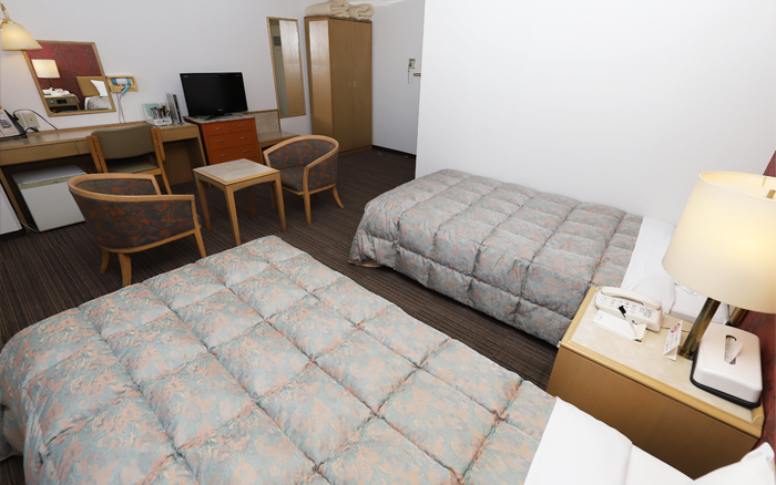 シングルベッドが2基のツインルーム。ご夫婦、カップルはもとより、ご友人とのご一緒におくつろぎいただけるお部屋です。24平米(シングルルーム2室分)というゆとりの広さが、旅の疲れを癒します。
